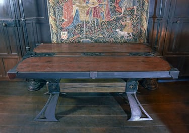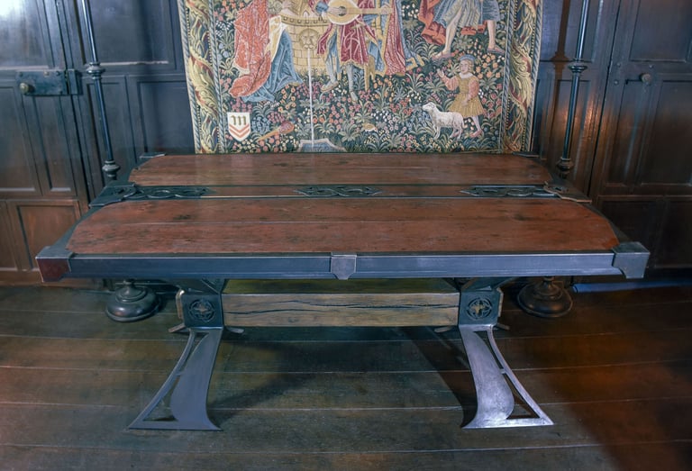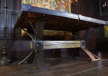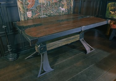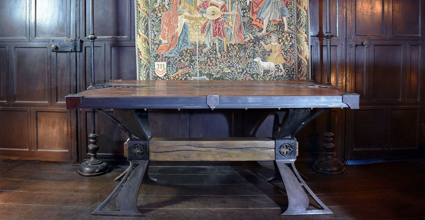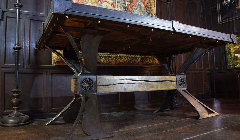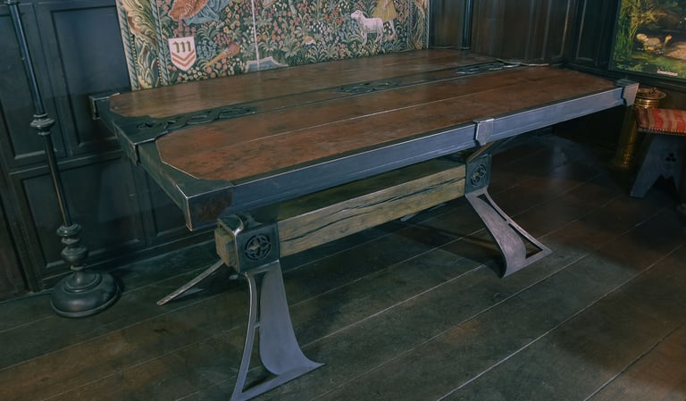 This design utilises 20mm thick shaped and polished steel to create a strong and classic industrial X-leg form tempered by exaggerated organic curves. The legs are tied together by a reclaimed solid oak post. The top utilises reclaimed mid-C19th timbers sourced from Harrogate, Yorkshire. They were originally used as shop flooring and retain a beautiful patina formed by 150 years of footfall on their polished surface. Each timber has been carefully worked and finished in order to preserve this unique history and character.