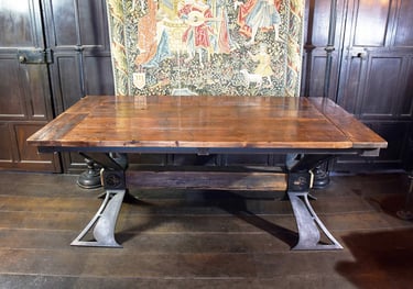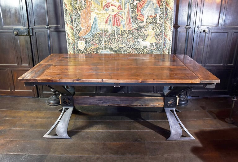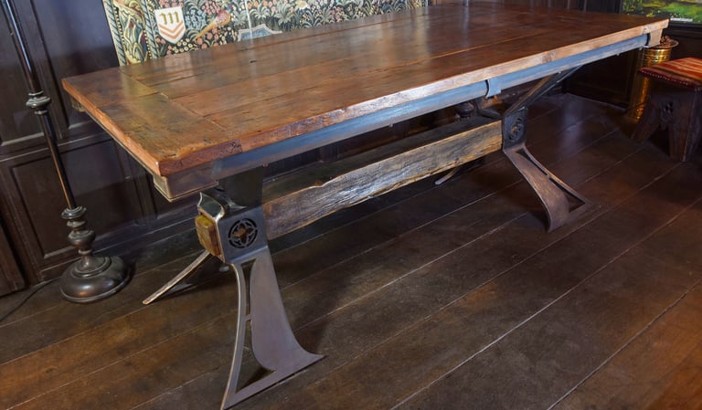 This design utilises 20mm thick shaped and polished steel to create a strong and classic industrial X-leg form tempered by exaggerated organic curves. The legs are tied together by a reclaimed solid oak post. The top utilises reclaimed mid-C19th timbers sourced from Harrogate, Yorkshire. They were originally used as shop flooring and retain a beautiful patina formed by 150 years of footfall on their polished surface. Each timber has been carefully worked and finished in order to preserve this unique history and character.